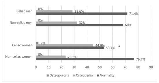 The following Figure 2 shows bone mineral density status according to T-score. In men, 29% of celiac and 32% of non-celiac presented values suggestive of osteopenia, and prevalence was similar in both groups. In the case of women, the data obtained showed less favorable results for the group of women with CD, since this group presented a greater and significant risk of osteopenia (44.9%) and osteoporosis (2%) compared to the group of non-celiacs. No relationship was found between these results and blood or intake data for critical nutrients for bone health (calcium, vitamin D, phosphorus) or physical activity.