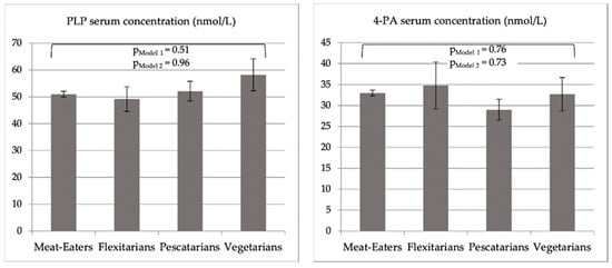 With respect to the vitamin B6 status, there is evidence to suggest reduced bioavailability [] as well as digestibility [] of vitamin B6 from plant foods compared to animal foods. However, previous studies on the vitamin B6 status among vegetarians are inconsistent, reporting lower [,] or similar [,] serum concentrations of pyridoxal-5′-phosphate (PLP) among vegetarians compared to non-vegetarians. One reason for the heterogeneous data on the vitamin B6 status among vegetarians may be that biomarkers of the vitamin B6 status, especially PLP, but also 4-pyridoxic acid (4-PA), are influenced by a range of potential confounders, such as obesity, smoking or inflammation [,], for which significant differences between vegetarians and non-vegetarians have been observed [,]. A comprehensive statistical adjustment for these factors has been missing in previous studies on the vitamin B6 status among vegetarians.
