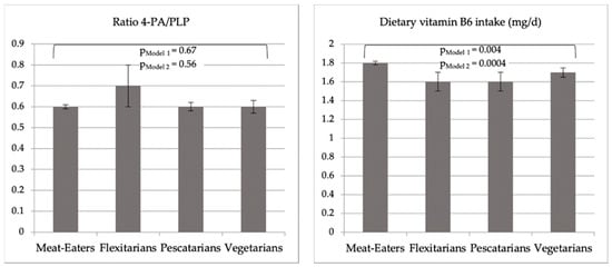 Vegetarians reported the most frequent use of dietary supplements containing vitamin B6 (44.6% vs. 31.8% among meat-eaters) (Table 1). Mean dietary vitamin B6 intakes (SEs) were 1.7 (0.05), 1.6 (0.1), 1.6 (0.1) and 1.8 (0.02) mg/d among vegetarians, pescatarians, flexitarians and meat-eaters, respectively. These differences were not statistically significant in a “crude” unadjusted regression model. However, linear regression analyses adjusted for age and sex showed a statistically significant difference in average dietary vitamin B6 intakes across all groups (Model 1, Figure 1, p = 0.004), driven by significantly lower levels of vegetarians compared to meat-eaters (at p = 0.0027), while no pairwise differences between the other groups were observed. These overall (Model 2, Figure 1 and Appendix A Table A3, p = 0.004) and pairwise differences between vegetarians and meat-eaters (p < 0.0001) remained statistically significant upon multivariable adjustment.
