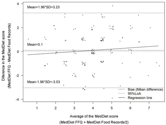 The mean ratings of the MedDiet score derived by the FFQ at baseline and follow-up 4.0 ± 1.5 and 4.1 ± 1.6, respectively, and for dietary records 4.0 ± 1.5. The FFQ significantly (p < 0.001) overestimated the MedDiet score (by 12%) compared to the corresponding MedDiet score derived by the reference method. However, no proportional bias was found (β coefficient 0.072; 95% CI-0.064, 0.204; p < 0.287) (Table 6 and Figure 1) across score ratings. The Pearson coefficient revealed a moderate and significant correlation (0.46 and p < 0.001) between the scores derived by the dietary records and FFQ. Additionally, the intraclass correlation coefficient, an indicator of the degree to which both instruments assigned the same absolute score ratings, showed the same degree of correlation (ICC = 0.46; p < 0.001). These findings indicate that the FFQ had a moderate ability to rank participants according to their adherence to the MedDiet. To analyze construct validity, we hypothesized a priori relationships between higher scores of the more favorable intake profiles for 17 nutrients. We found that intakes of 17 nutrients were associated in the anticipated direction with MedDiet score ratings derived by the FFQ, the associations were significant for nearly 50% of the nutrients (Supplementary Table S1).