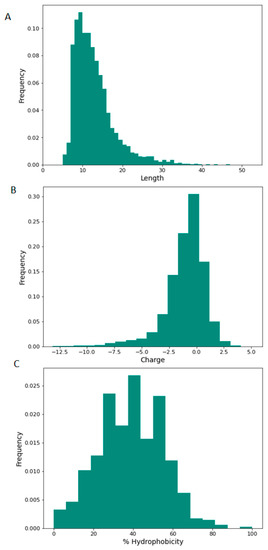 Physicochemical properties of NRT_N0G5IJ peptide profile as determined by LC–MS/MS. Histogram representation of NRT_N0G5IJ peptide distribution according to (A) length, (B) charge, and (C) percentage hydrophobicity; peptide counts are displayed on the y-axis.