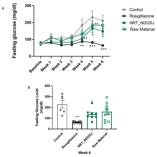 NRT_N0G5IJ significantly increases the ability to regulate blood glucose levels in db/db mice. Mice were treated with NRT_N0G5IJ (400 mg/kg/day), raw material (400 mg/kg/day), rosiglitazone (15 mg/kg/day), or vehicle by oral gavage. (A) Fasting blood glucose concentrations were determined weekly for 6 weeks. Two-way ANOVA analysis with Dunnett’s post hoc test. (B)) One-way ANOVA analysis of fasting blood glucose levels at week 6. Data are the mean ± SEM of n = 9 per group (* p < 0.05, ** p < 0.01; *** p < 0.001).