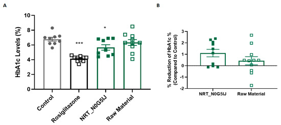 NRT_N0G5IJ significantly decreased HbA1c concentrations in diabetic db/db mice in a hydrolytic-specific manner. (A) The effect of rosiglitazone (15 mg/kg/day), NRT_N0G5IJ (400 mg/kg/day), or raw material (400 mg/kg/day) versus vehicle control on HbA1c concentrations in db/db mice was determined after 4 weeks of treatment. Mice were treated with 400 mg/kg/day of NRT_N0G5IJ, or vehicle by oral gavage. Data are the mean ± SEM (n = 9) after 4 weeks of treatment. (B) The effect of NRT_N0G5IJ and associated unhydrolysed raw material on HbA1c in db/db mice relative to untreated control mice was determined. Mice were treated with 400 mg/kg/day of NRT_N0G5IJ or raw material by oral gavage, or a similar volume (5 mL/kg) of vehicle. Data are the mean ± SEM (n = 9) after 4 weeks of treatment (* p < 0.05, *** p < 0.001).