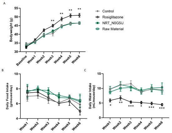 Effect of treatment on body weight, food, and water intake. Measurements of (A) body weight, (B) food intake, and (C) water intake on mice treated with NRT_N0G5IJ (400 mg/kg/day), raw material (400 mg/kg/day), rosiglitazone (15 mg/kg/day), or vehicle by oral gavage. Data are the mean ± SEM and analysed by Dunnett’s multiple comparisons tests as applicable (* p < 0.05, ** p < 0.01, *** p < 0.001; compared to vehicle).