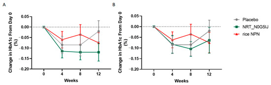 NRT_N0G5IJ treatment decreased HbA1c percentage in a prediabetic population. NRT_N0G5IJ (15 g/day) administration elicited a significant decrease in HbA1c relative to either placebo or control rice NPN in (A) per protocol (PP) or (B) intention to treat (ITT) populations (GEE analysis; data are represented as the mean ± SEM).