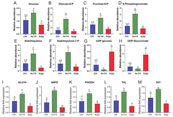 Dietary FA modulates glucose metabolism in MDA-MB-231 tumors. Comparison of glucose-linked metabolites in MDA-MB-231 tumors from control (Ctrl, 2 ppm FA), FA-deficient (No FA, 0 ppm FA), or FA-supplemented (Supp, 12 ppm FA) diets (n = 6 samples/group) (A–H). Relative abundance of glucose (A), glucose-6-P (B), fructose-6-P (C), 6-phosphogluconate (D), sedohepulose (E), sedohepulose-7-P (F), UDP-glucose (G), UDP-glucuronate (H). Expression of GLUT4 (I), H6PD (J), PHGDH (K), TAL (L), and TKT (M) measured by qPCR in tumors from each diet group (n = 5/group). One-way ANOVA used to determine statistical significance (p < 0.05), different letters indicate significant differences.