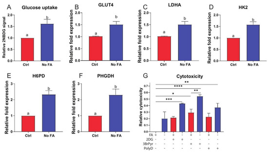 Effect of FA on glucose metabolism in cultured MDA-MB-231 cells. MDA-MB-231 cells cultured in standard (2.2 µM) or FA-deficient (0 µM) medium for 3 weeks prior to analysis. Glucose uptake determined by 2NBDG staining (n = 3/group) (A). Expression of GLUT4 (B), LDHA (C), HK2 (D), H6PD (E), and PHGDH (F) determined by qPCR (n = 3/group). Cytotoxicity following withdrawal of FA in the presence of 50 mM 2-deoxyglucose (2DG), 30 µM 3-bromopryuvate (3BrPyr), or 10 µM polydatin (PolyD) for 48 h as determined by MTT assay (n = 4/group) (G). Student’s t-test (A–F) or one-way ANOVA (G) used to determine statistical significance (p < 0.05) between groups. Different letters indicate significant differences determined by Student’s t-test. Asterix’s indicate significant differences determined by one-way ANOVA (* p < 0.05, ** p < 0.01, *** p < 0.001, **** p < 0.0001).