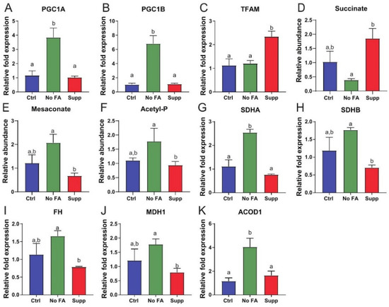 FA restriction enhances mitochondrial dysfunction in MDA-MB-231 tumors. Expression of PGC1α (A), PGC1ß (B), and TFAM (C) measured by qPCR in tumors from each diet group (n = 5/group). Relative abundance of succinate (D), mesaconate (E), acetyl-P (F) MDA-MB-231 tumors from control (Ctrl, 2 ppm FA), FA-deficient (No FA, 0 ppm FA), or FA-supplemented (Supp, 12 ppm FA) diets (n = 6 samples/group). Expression of SDHA (G), SDHB (H), FH (I) and MDH1 (J), and ACOD1 (K) measured by qPCR in tumors from each diet group (n = 5/group). One-way ANOVA used to determine statistical significance (p < 0.05), different letters indicate significant differences.