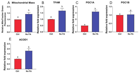 Mitochondrial response in cultured MDA-MB-231 cells to medium FA withdrawal. MDA-MB-231 cells were cultured with 0 or 2.2 µM FA for 3 weeks prior to assessment of mitochondrial characteristics. Mitochondrial mass determined by MitoTracker Green (n = 3/group) (A). Expression of TFAM (B), PGC1α (C), PGC1ß (D), and ACOD1 (E) determined by qPCR (n = 3/group). Student’s t-test was used to determine statistical significance between groups (p < 0.05), different letters indicate significant differences.