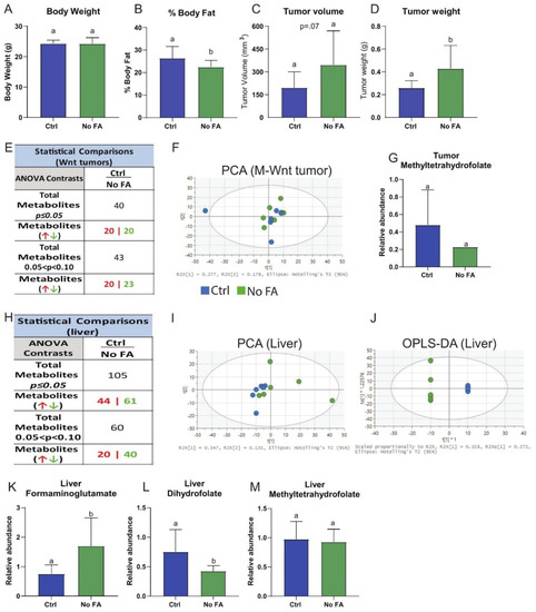 Dietary FA restriction enhances growth of orthotopically transplanted M-Wnt mammary tumors and minimally effects tumor metabolomic profile. Body weight of mice fed different folate diets for 3 weeks (A) (n = 10–14/group). Body composition determined by echo MRI (B) (n = 10–14/group). Ex vivo tumor volume (C) and weight (D) (n = 9–13/group). Summary of tumor metabolomics (E), PCA of tumor metabolomics (F) (n = 6/group). Tumor metabolite levels of 5-mTHF (G) (n = 6–7/group), different letters indicate significant differences.