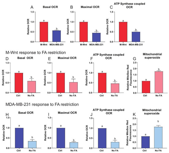 Innate mitochondrial dysfunction underpins response to FA restriction. Basal (A), maximal (B), and ATP synthase-coupled (C) OCR determined in M-Wnt cells and MDA-MB-231 cells (n = 3/group). Basal (D), maximal (E), and ATP synthase-coupled (F) OCR determined in M-Wnt cells following 3 weeks of culture with or without FA (n = 3/group). Mitochondrial superoxide production (G) determined using MitoSox Red in M-Wnt cells following 3 weeks of culture with or without FA (n = 3/group). Basal (H), maximal (I), and ATP synthase-coupled (J) OCR determined in MDA-MB-231 cells following 3 weeks of culture with or without FA (n = 3/group). Mitochondrial superoxide production (K) determined using MitoSox Red in MDA-MB-231 cells following 3 weeks of culture with or without FA (n = 3/group). Student’s t-test (A–K) used to determine significance (p < 0.05), different letters indicate significant differences.
