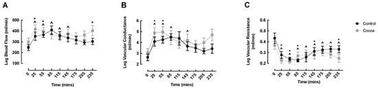 Cocoa did not enhance oral nutritional supplement feeding-induced changes in leg blood flow (A), vascular conductance (B) or vascular resistance (C) of healthy older adults. ^ denotes significant within condition difference from control baseline (p < 0.05); * denotes significant within condition difference from cocoa baseline (p < 0.05).