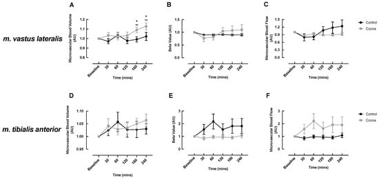 In the m. tibialis anterior, MBV, MFV and MBF did not change over time within the cocoa or control condition and there were no significant differences between the conditions (Figure 3D–F). However, there was a trend for increased MBV in the cocoa condition at 240 min post-meal (baseline: 1.00 vs. 240 min: 1.06 ± 0.03, p = 0.058), which was not observed in the control condition (Figure 3D).