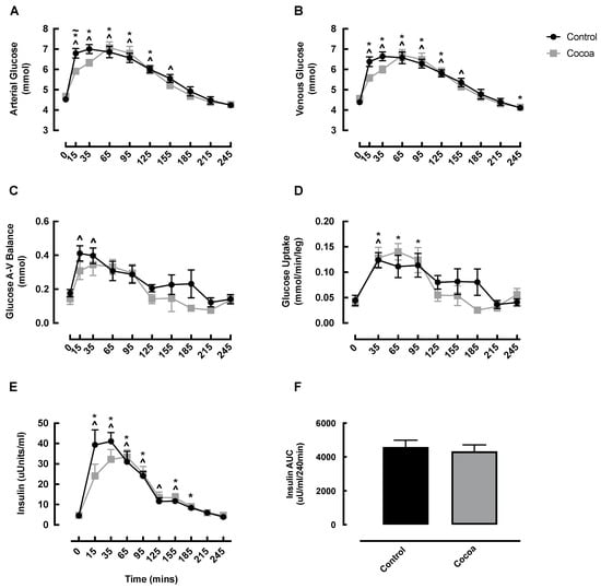 Changes in arterial glucose (A), venous glucose (B), glucose A-V balance (C), glucose uptake (D), insulin (E) and insulin AUC (F) in healthy older adults in response to cocoa or control, following oral nutritional supplement feeding. ~ denotes a significant difference between conditions (p < 0.05); ^ denotes significant difference from control baseline (p < 0.05); * denotes significant difference from cocoa baseline (p < 0.05). AUC, area under the curve; A-V, arterio-venous.