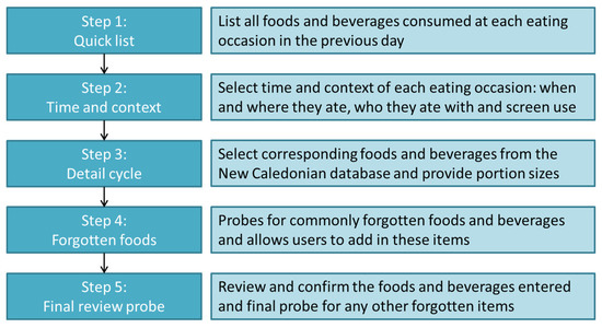The New Caledonian food composition database described in the remainder of this paper was developed for integration into the backend of a mobile app-based 24-h recall tool, i.e., iRecall.24, that could be used to collect dietary information of children and adults. The iRecall.24 app functions in a similar way as other electronic self-administered 24-h recall tools (e.g., ASA-24 [39], Intake24 [40], and myfood24 [41]), whereby users undertake the multiple-pass 24-h recall process. The multiple-pass method involves users recalling their food intake over the previous 24 h according to five steps, as depicted in Figure 1. In the iRecall.24 app, firstly, the user provides a quick list of foods and beverages consumed at each eating occasion during the previous day. Details are collected about the time and context of each eating occasion including when and where they ate, who they ate with, and the presence of screen use (e.g., from television, smartphone, etc.). Then, users provide details about the foods and beverages consumed, by selecting corresponding foods from the New Caledonian database, estimating portion sizes of foods consumed, and reviewing items entered. Multiple probes are implemented in the app at each step to ensure that commonly forgotten foods and beverages (e.g., condiments, sweet and savory discretionary foods, soft drinks, and alcohol) have been captured and that users are able to add any additional items. Users are provided with a final opportunity to review and confirm the foods and beverages entered and a final probe for any other forgotten items is conducted. For the purposes of collecting dietary data in New Caledonia, the iRecall.24 app version 1.0 was developed in French, with corresponding French language version of the New Caledonian food composition database used. The development of the iRecall.24 app is described elsewhere.