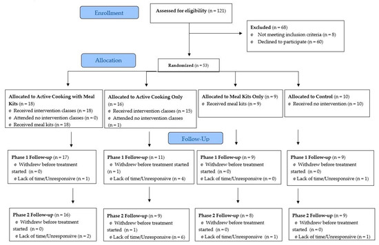 Repeated measures analysis (SAS, PROC MIXED) was used to assess changes over time in Cooking and Food Provisioning Action Scales, Healthy Eating Index scores, and the average number of meals cooked at home. Linear contrasts were constructed to assess within-group changes during phases 1 and 2 and to compare treatment groups on the magnitude of change. All analyses were performed using SAS Version 9 statistical software (SAS Institute, Cary, NC, USA). Statistical significance was based on α = 0.05.