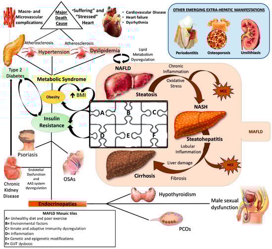 Currently, NAFLD is considered the hepatic manifestation of metabolic syndrome (MS) [3] and recently, an expert consensus established that metabolic- (dysfunction) associated fatty liver disease (MAFLD) represents the more adequate denomination, revealing its larger and deeper nature as systemic disorder [4] (Figure 1).