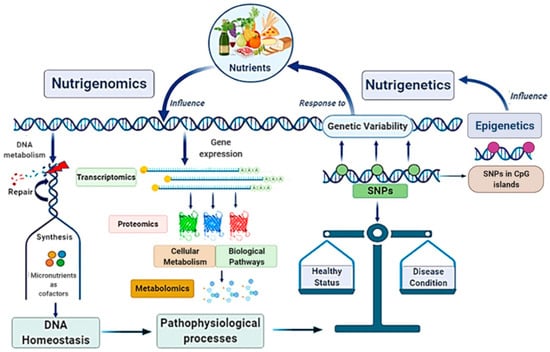 Nutrigenomics and nutrigenetics: two sides of the same medal with several linked approaches. Genome influences the responsiveness to nutrients (nutrigenetics’ field); at the same time, nutrition can also modify gene expression involving epigenetic mechanisms (nutrigenomics’ field). Nutrigenomics investigates the effects deriving from the interaction between the nutritional environment and inherited factors. Given the complexity of the scenario, nutrigenomics quests include several approaches involving many other disciplines. Nutritional factors and genetic ones influence each other: on one side, nutrients affect DNA metabolism, gene expression, and genetic variability; on the other side, genetic variants (as SNPs), by determining specific individual genotype, influence dietary habits. In turn, nutrigenetics could also be influenced by epigenetics. Altogether, these mechanisms contribute to determinate the status of health or a condition disease. SNPs, Single Nucleotide Polymorphisms.
