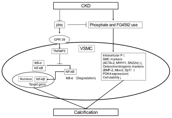 Some recently presented studies reported that zinc plays an important role in inhibition of calcification using VSMCs. Zinc sulfate blunted phosphate-induced calcification and decreased messenger RNA expression by osteogenic markers including TNFAIP3 expression, which subsequently was shown to inhibit NF-kB activation and osteo-/chondrogenic reprograming, resulting in suppression of phosphate-induced calcification of VSMCs [17] (Figure 1).