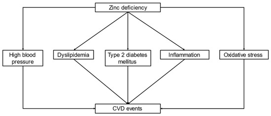 Zinc deficiency is also associated with various risk factors related to CVD events, such as high blood pressure, dyslipidemia, type 2 diabetes mellitus, inflammation, and oxidative stress (Figure 2).