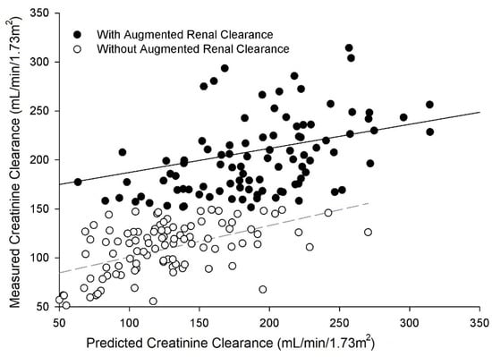 - Udy, A.A.; Roberts, J.A.; Shorr, A.F.; Boots, R.J.; Lipman, J. Augmented renal clearance in septic and traumatized patients with normal plasma creatinine concentrations: Identifying at-risk patients. Crit. Care 2013, 17, R35. [Google Scholar] [CrossRef] [PubMed]