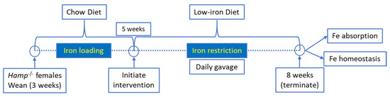 All animal studies were approved by Institutional Animal Care and Use Committee (IACUC) of the University of Florida. Hepcidin KO (Hamp−/−) mice on the C57BL/6 genetic background were bred in our animal facility. Female Hamp−/− mice were weaned onto a standard chow diet and then, at 5 weeks of age, were switched to low-iron diet (2–6 ppm Fe; Envigo: TD.80396) for the remainder of the experiment (a schematic of the experimental design is provided in Figure 1). These diets contain only inorganic (non-heme) iron. At 5 weeks of age, when consuming a chow diet, these mice are significantly iron loaded, with hepatic non-heme iron levels >20× higher than sex- and age-matched WT mice [11]. Dietary iron restriction was utilized for two reasons: first, we postulated that knock down of Dmt1 would likely be more effective at attenuating absorption when dietary iron was low. This was particularly relevant since the extent of in vivo Dmt1 silencing was uncertain, and modest decreases in Dmt1 activity would likely be more impactful when enteral iron was lower (since the ratio of substrate ions [Fe] to transporter molecules [Dmt1] would also be lower); and second, we sought to assess the impact of dietary iron restriction on the iron-loading phenotype in Hamp−/− mice (since this is a logical approach to reduce body iron burden in HH). One day after the dietary switch, mice were given saline (control) or freshly made NC-siRNA or Dmt1-siRNA loaded FA-GDLVs daily (3.75 nmol/dose) by oral, intragastric gavage for 21 days. On each day of the experiment, mice were fasted for three hours before receiving the gavage treatment and then given food immediately thereafter. Water was always provided ad libitum. Our previous studies demonstrated that orally administered GDLVs/siRNAs are non-toxic and non-inflammatory in mice [11,12,17]. At the end of the intervention, half of the mice were euthanized to harvest blood and tissues (liver, spleen, heart, kidney, pancreas, bone marrow and different segments of intestine), and the other half were used for an iron (59Fe) absorption study (as described below).