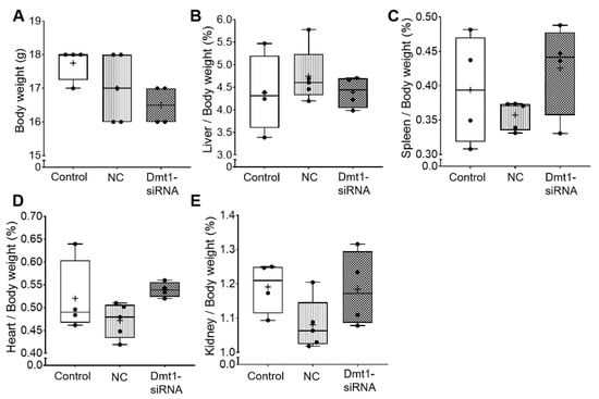 Body weight and tissue weights were not affected by FA-GDLV/siRNA treatments. Body weight (A), and relative liver (B), spleen (C), heart (D), and kidney (E) weights (as a percentage of total body weight) were quantified in experimental mice. Data are presented as box plots for n = 4–5 mice per group. No statistically significant differences were noted between groups (as determined by one-way ANOVA). NC, negative control. +, mean value.