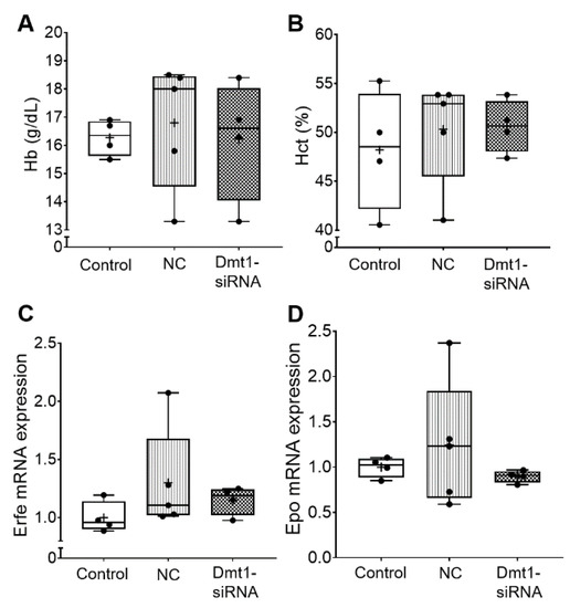 Blood hemoglobin and hematocrit levels were also not altered by the experimental treatments (Figure 3). Consistent with this, biomarkers of erythropoietic demand, including bone marrow erythroferrone (Erfe) [27] and renal erythropoietin (Epo) mRNA expression, were unaffected by FA-GDLVs/siRNA exposure (Figure 3). Note that the magnitude of mRNA expression of Epo and Erfe accurately reflects circulating levels of the functional hormones since both genes are regulated transcriptionally (Erfe probably by Epo/Epo receptor signaling [27], and Epo by hypoxia-inducible trans-acting factors [28]).