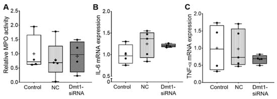 Inflammatory biomarkers did not change after treatments. MPO activity in duodenal epithelial tissue was measured (A). IL-6 mRNA expression (B) and TNF-α mRNA expression (C) in liver were also analyzed. Data are presented as box plots for n = 4–5 mice per group. No statistically significant differences were noted between groups (as determined by one-way ANOVA). NC, negative control; +, mean value.