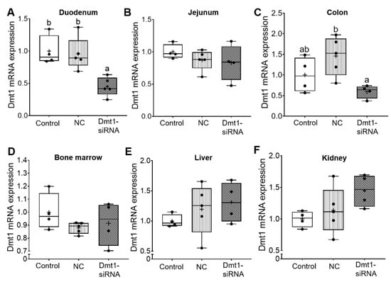 FA-GDLVs loaded with Dmt1 siRNA decreased Dmt1 mRNA expression in duodenum. Female Hamp−/− mice were weaned onto a standard chow diet and then switched to a low-iron diet 1 day before NP treatment. Starting at 5 weeks of age, mice were orally gavaged with saline (control), negative control-siRNA (NC-siRNA) or DMT1-siRNA FA-GDLVs daily for three weeks. Dmt1 mRNA expression was quantified in duodenum (A), jejunum (B), colon (C), bone marrow (D), liver (E), and kidney (F). Expression of experimental genes was normalized to expression of Cyclophilin. Data are presented as box plots for n = 4–5 mice per group. Statistical significance was assessed by one-way ANOVA (A–F), followed by a Tukey’s multiple comparisons test (A,C). Groups labeled with different letters differ significantly. p = 0.0037 (A), p = 0.0239 (C). NC, negative control; +, mean value.