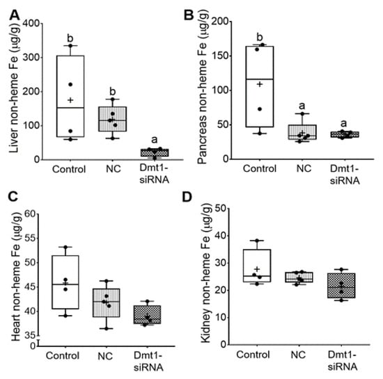 FA-GDLVs/siRNA administration decreased liver and pancreatic iron levels. Shown is non-heme Fe content in liver (A), pancreas (B), heart (C), and kidney (D). Data were analyzed by one-way ANOVA (A–D), followed by Tukey’s multiple comparisons test (A,B). Data are presented as box plots for n = 4–5 mice per group. Groups labeled with different letters differ significantly. p = 0.0048 (A), p = 0.0264 (B). NC, negative control; +, mean value.