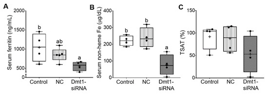 FA-GDLVs/DMT1 siRNA treatment decreased whole body and serum iron content. Shown are serum ferritin levels (A), serum non-heme Fe content (B), and blood TSAT (C). Data were analyzed by one-way ANOVA (A–C), followed by Tukey’s multiple comparisons test (A,B). Data are presented as box plots for n = 4–5 mice per group. Groups labeled with different letters differ significantly. p = 0.0433 (A), p = 0.0036 (B). NC, negative control; +, mean value.