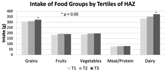 Intake of five food groups by tertile of HAZ among US children aged 2–18 years, NHANES 2007–2014 (n = 6116). Each tertile was defined as follows: T1 (low HAZ), T2 (medium HAZ), T3 (high HAZ) * Tested by ANOVA and adjusted for age, gender, ethnicity and birth weight. HAZ, height-for-age Z score.