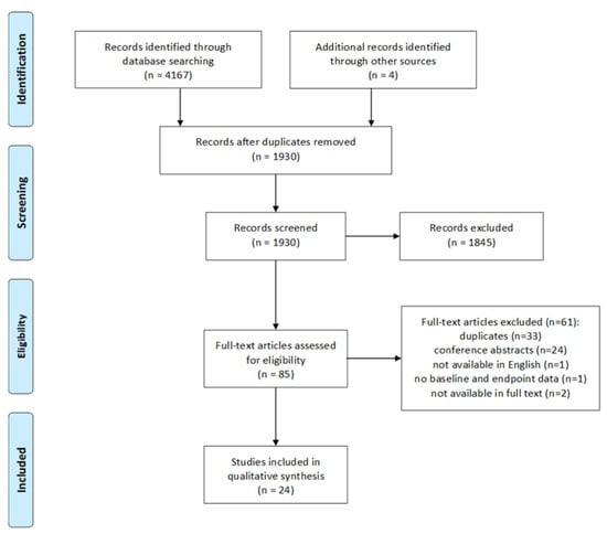 The results of the literature search and selection process are shown in Figure 1. In total, 4167 records were obtained from the search, and four additional records were identified through reference lists from other reviews. After initially removing duplicate records (n = 2241) based on titles and abstracts, a further 1845 records were excluded as these did not assess interventions with bilberry or grape seed extracts, or were studies which performed in vitro or in animal models. The remaining 85 records were further analyzed for full-text availability. We identified and removed 24 records, which were conference abstracts or registered clinical trials without publications, and removed 33 duplicate records. We also excluded one record as it was not available in English, one record as it did not provide baseline and endpoint data, and two records as these were not available in full text. In total 24 studies were analyzed for this review.