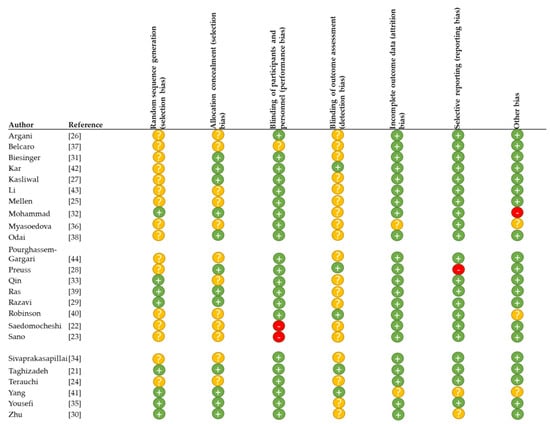 The Cochrane bias evaluation was performed to evaluate study and reporting quality (Figure 2) []. The method for randomization was not described in 16 out of 24 studies, and concealment of intervention allocation was not described in half of the studies (n = 12). Participants and researchers were blind to the intervention sequence in most studies (n = 21). One study did not describe the blinding process [], and two studies described issues which may have affected the blinding: an unequal number of capsules for the intervention and placebo [] and blinding of researchers but not participants to the intervention sequence []. Two studies reported dropouts, but did not mention baseline population characteristics after dropouts [,]. One study only reported blood pressure outcomes for selective individuals with hypertension []. We detected gender imbalance between intervention and placebo groups in two studies [,]. In one study, baseline levels of insulin and HOMA-IR, the main outcomes in this study, were significantly different between intervention and placebo groups at baseline []. Two studies reported unequal participant numbers in intervention and placebo group after dropouts [,]. Half of the studies did not report withdrawals or dropouts; the reported drop-out rates ranged from 1% to 38% (Table 1).