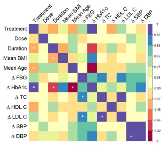Correlation heatmap of study characteristics, subject characteristics and percentage change in fasting blood glucose, HbA1c, cholesterols and blood pressure levels across 24 studies. The treatments were expressed as numbers (bilberry and blackcurrant = 1, grape seed = 2). Mean BMI and age were calculated for each study population where reported. FBG—fasting blood glucose, HbA1c—glycated hemoglobin, TC—total cholesterol, HDL C—high density lipoprotein cholesterol, LDL C—low density lipoprotein cholesterol, SBP—systolic blood pressure, DBP—diastolic blood pressure. The matrix was calculated using corrplot [] in R studio. * p < 0.01.