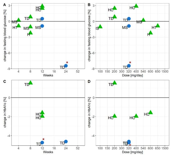 Relationship between the average change in fasting blood glucose and study duration (A), or dose (B), and between the average change in HbA1c levels and study duration (C), or dose (D). ● = bilberry and blackcurrant extract (blue), ▲ = grape seed extract (green), study population: H = healthy, HC = hypercholesterolemia, HT = hypertension, MS = metabolic syndrome, TD = Type 2 Diabetes Mellitus. * published p-value < 0.05.