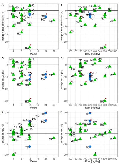 Relationship between total cholesterol and study duration (A), or dose (B), LDL cholesterol and study duration (C), or dose (D), HDL cholesterol and study duration (E), or dose (F). ● = bilberry and blackcurrant extract (blue), ▲ = grape seed extract (green), study population: H = healthy, HC = hypercholesterolemia, HT = hypertension, MP = mixed postmenopausal, MS = metabolic syndrome, TD = Type 2 Diabetes Mellitus. * published p-value < 0.05.