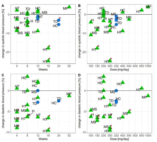 Relationship between systolic blood pressure and study duration (A), or dose (B), diastolic blood pressure and study duration (C) or dose (D). ● = bilberry and blackcurrant extract (blue), ▲ = grape seed extract (green), study population: H = healthy, HC = hypercholesterolemia, HT = hypertension, MP = mixed postmenopausal, MS = metabolic syndrome, TD = Type 2 Diabetes Mellitus. * published p-value < 0.05.