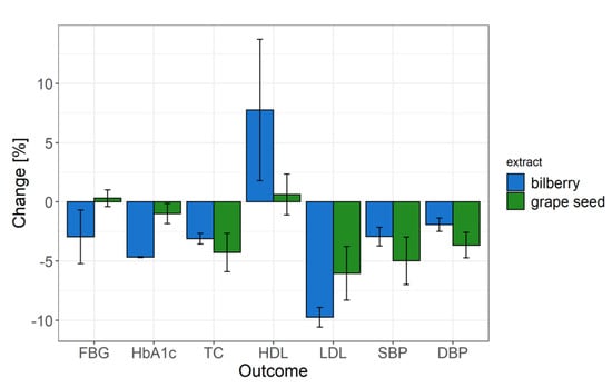 Calculated means and standard errors of percentage changes in study outcomes (FBG—fasting blood glucose, HbA1c—glycated hemoglobin, TC—total cholesterol, HDL and LDL cholesterol, SBP—systolic blood pressure, DBP—diastolic blood pressure) across all intervention studies with bilberry interventions (blue) and grape seed interventions (green).