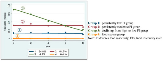 Based on five waves of FIS scores (missing data = 538, 28% for one wave and 415, 21.6% for two waves), the three-class solution for the data on food-insecure individuals was the best fit in GBTM because of its exceptionally low BIC. Accordingly, the following four groups were created: persistently low FI, persistently moderate FI, declining from high to low FI, and no FI (food-secure individuals) (Figure 1). The persistently low FI group (n = 477, 24.8%) was estimated to have an intercept at 0.1 on the FIS in wave 1 and retained the same value across all waves, while the persistently moderate FI group (n = 1242, 64.7%) had an intercept at 0.3 and remained stable. The last group, with FI declining from high to low (n = 79, 4.1%), had an estimated intercept at 0.7 on the FIS in wave 1 and dropped to 0.2 in wave 5. There were other individuals who did not report any form of FI across all waves, and were thus classified under the food-secure group (n = 123, 6.4%).