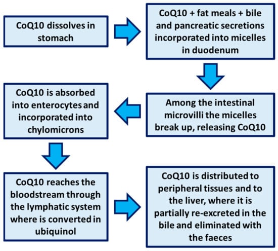 CoQ10 has a very low and variable oral bioavailability, depending on many factors such as the dosage of administration, the type of formulation, the release method, and the mode of administration (e.g., before, during or after meals) []. Indeed, if administered in fed state, CoQ10 arrives in the intestinal lumen with exogenous cholesterol, then is taken up from the mixed micelles, together with meal fats, bile, and pancreatic secretions, which facilitate its solubilization and the entrance into enterocytes via the “simple passive facilitated diffusion” (“passive” because energy consumption is not required and “facilitated” because a lipid carrier, usually a monoglyceride fat, makes possible the intestinal transport). CoQ10, incorporated in the chylomicrons in the enterocytes, subsequently reaches the blood through the lymphatic system. From the bloodstream, CoQ10 is distributed to peripheral tissues and to the liver, where it is partially re-excreted in the bile and eliminated with the feces (Figure 2) []. The main limiting factor of low bioavailability of CoQ10 (molecular weight = 863) is its poor solubility in gastrointestinal fluids. For this reason, various formulations have been proposed in the market in the form of tablets, capsules, chewable tablets, and gels containing oily suspensions to improve CoQ10 bioaccessibility and bioavailability. The reduction of particle size (e.g., the use of nanoparticles) and the setup of biopharmaceutical strategies like the use of the β-cyclodextrin complex, liposomes, emulsions, nanostructured lipid carriers, and micelles have already been demonstrated to improve the CoQ10 bioavailability with satisfactory results [,].