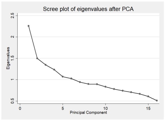 Third, we investigated whether PHDI had more than one factor that explained the variability of the data. For that, we used the principal component analysis (PCA) to access the correlation between the 16 components to check if there was more than one factor that explains the variability. In the PCA analysis, the correlation matrix was obtained using varimax rotation and only eigenvalues > 1 was used to determine the number of factors [26]. The Scree test was used as an auxiliary method, as it allowed us to present the amount of variation of each of the main components or factors [27].