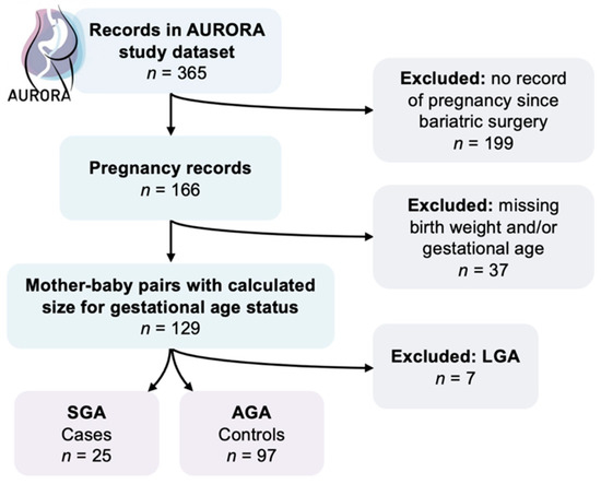 There were 129 singleton pregnancies in the AURORA dataset with complete data for infant sex, birth weight, and gestational age (Figure 1). These babies were plotted against size for gestational age percentiles for birth weight, gestational age, infant sex, and parity in Flanders, Belgium (Figure 2). Seven babies were above the 90th percentile and were excluded from the study. Twenty-five babies fell under the 10th percentile and became SGA cases. The remaining 97 babies between the 10th and 90th percentiles served as AGA controls. Many of the AGA babies fell closer to the 10th percentile than the 90th percentile, highlighting how there is a decrease in size for gestational age after bariatric surgery compared with the general birth population in Flanders.