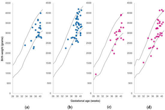 AURORA cohort babies plotted against 10th and 90th size for gestational age percentiles for birth weight, gestational age, infant sex, and parity in Flanders, Belgium using SPE data: (a) primiparous boys; (b) multiparous boys; (c) primiparous girls; (d) multiparous boys.