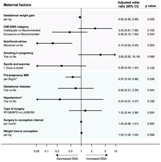Age-adjusted analysis of maternal factors and their association with SGA. Modifiable factors are highlighted in pink, and clinical indicators are highlighted in blue. * The result for hypertension is a crude odds ratio (95% CI) due to zero cases in the SGA group.