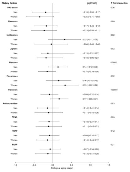 Sub-group analyses revealed that the associations of Δage with certain polyphenol sub-classes differed by sex; in particular, isoflavones and flavones were inversely associated with Δage in women but not in men (p values for interaction = 0.02 and 0.0002, respectively), whereas lignans showed a greater inverse association with Δage in women as compared to men (p value for interaction = 0.02); finally, flavanols were inversely correlated with Δage in men (β = −0.09; 95%CI −0.32, 0.14) while being directly associated among women (β = 0.17; 95%CI −0.06, 0.41; p for interaction < 0.0001) (Figure 1).