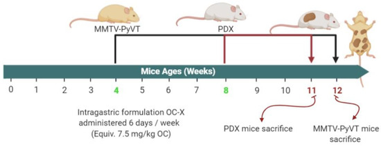 Schematic overview of in vivo studies in MMTV-PyVT and PDX mice. Mice were randomly divided into placebo control and OC-X treated groups. OC-X was dissolved in sterile water and administered by oral gavage 6×/week, at a dose equivalent to 7.5 mg/kg OC. MMTV-PyVT mice began treatments on the fourth week of age and ended at week 12, while the PDX mice began treatments on the eighth week of age and ended at week 11.