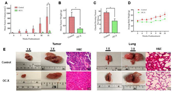 OC-X suppressed tumor growth and metastasis in the lungs in MMTV-PyVT transgenic mice. (A) Tumor volumes monitored for treatment and placebo control groups and measured over the 4th to 12th weeks of mice age. A caliper was used to measure individual tumors with the formula V = (W2 × L)/2, where V is the volume, W is the width, and L is the length of the tumor. The results show significant tumor suppression in OC-X treated mice (7.5 mg/kg OC by oral gavage, 6×week, n = 4 mice) versus the control group (n = 3 mice). (B) Comparison of the collective mean tumor weight collected from the glands of treatment and control groups after mice were sacrificed at the end of the experiment. (C) Comparison of the incidence of tumor development in OC-X treated versus control group mouse glands. OC-X treatments reduced the incidence of palpable lesions in most of the treated mouse glands (22 mammary glands out of 40 had tumors; 55%), leading to decreased mice tumor burden in the treatment group versus the control (28 mammary glands out of 30 had tumors; 93%). (D) The mean average body weights for each mice group were monitored over the experiment duration. No significant mice body weight change was observed between treated and control animals. (E) Comparison of representative tumor images of the OC-X treatment versus control group mice. Photographs are shown in two magnifications, 1× and 3×, highlighting the vascularity and morphological changes of mice tumors and lungs in both groups. H&E staining was utilized to compare treated and control mice tumor micromorphology using 40× magnification. p-value indicated by using Student’s t-test, * p < 0.05.