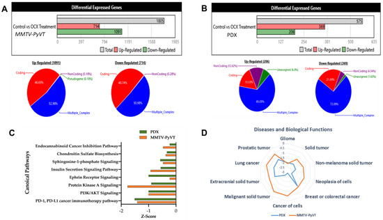 Tumor samples of OC-X and control-treated MMTV-PyVT and PDX mice were subjected to Mouse/Human Gene Chip Clariom™ S array analysis, which serves as a next-generation transcriptome profiling tool. This technology is widely used for the detection of differentially expressed genes (DEGs) to explore gene-level expression correlation among treatment groups, revealing the effectiveness of the targeted treatment [33]. Preliminary bioinformatics analysis of the raw data of the MMTV-PyVT tumor sample results of the Mouse Clariom S Microarray analysis revealed 1805 genes affected by OC-X treatment out of 22,206 genes (Figure 4A). Among these, 714 genes were upregulated and 1091 genes were downregulated. About 52.98% of the upregulated genes originated from multiple complexes, while 46.65% were coding genes (Figure 4A, left circle). Nearly 50.98% of the downregulated genes originated from multiple complexes, and 48.74% were coding genes (Figure 4A, right circle). On the other hand, microarray analysis of the PDX mice tumor samples preformed using the Human Clariom S Microarray analysis showed a total of 575 differentially expressed genes affected by OC-X treatment out of 21,448 genes (Figure 4B). Among them, 369 genes were upregulated and 206 genes were downregulated. The upregulated genes contained 65.05% that originated from multiple complexes, while 15.53% were coding genes (Figure 4B, left circle). The downregulated genes contained 72.09% that originated from multiple complexes, while 21.95% were coding genes (Figure 4B, right circle).